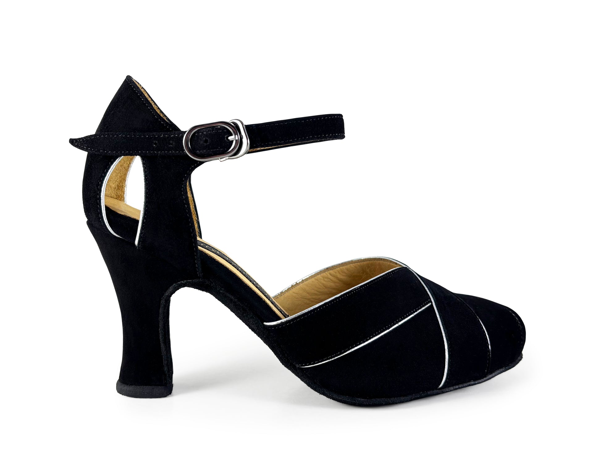 Shown in Black Suede Skin and piping in Pewter Metallic Skin.