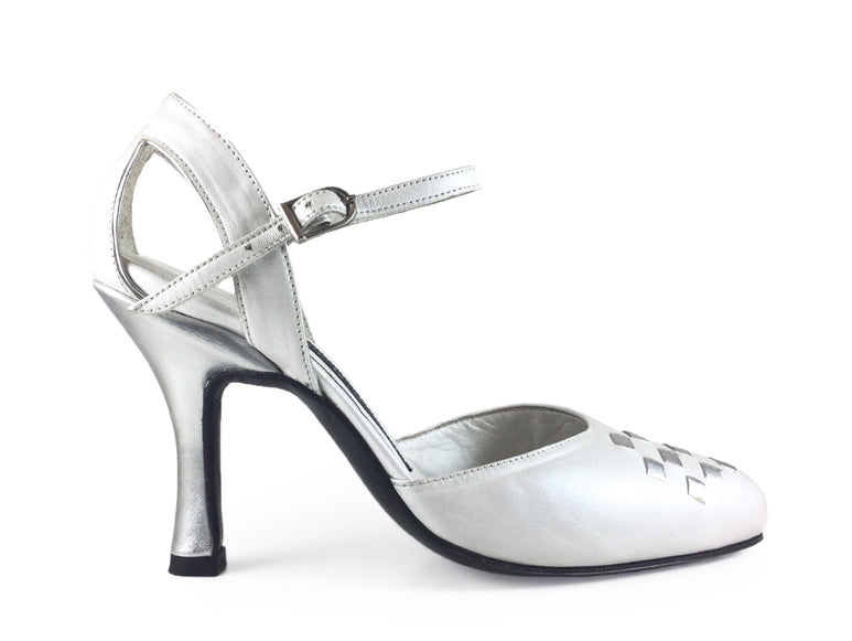 Shown in White Leather and Silver Metallic.