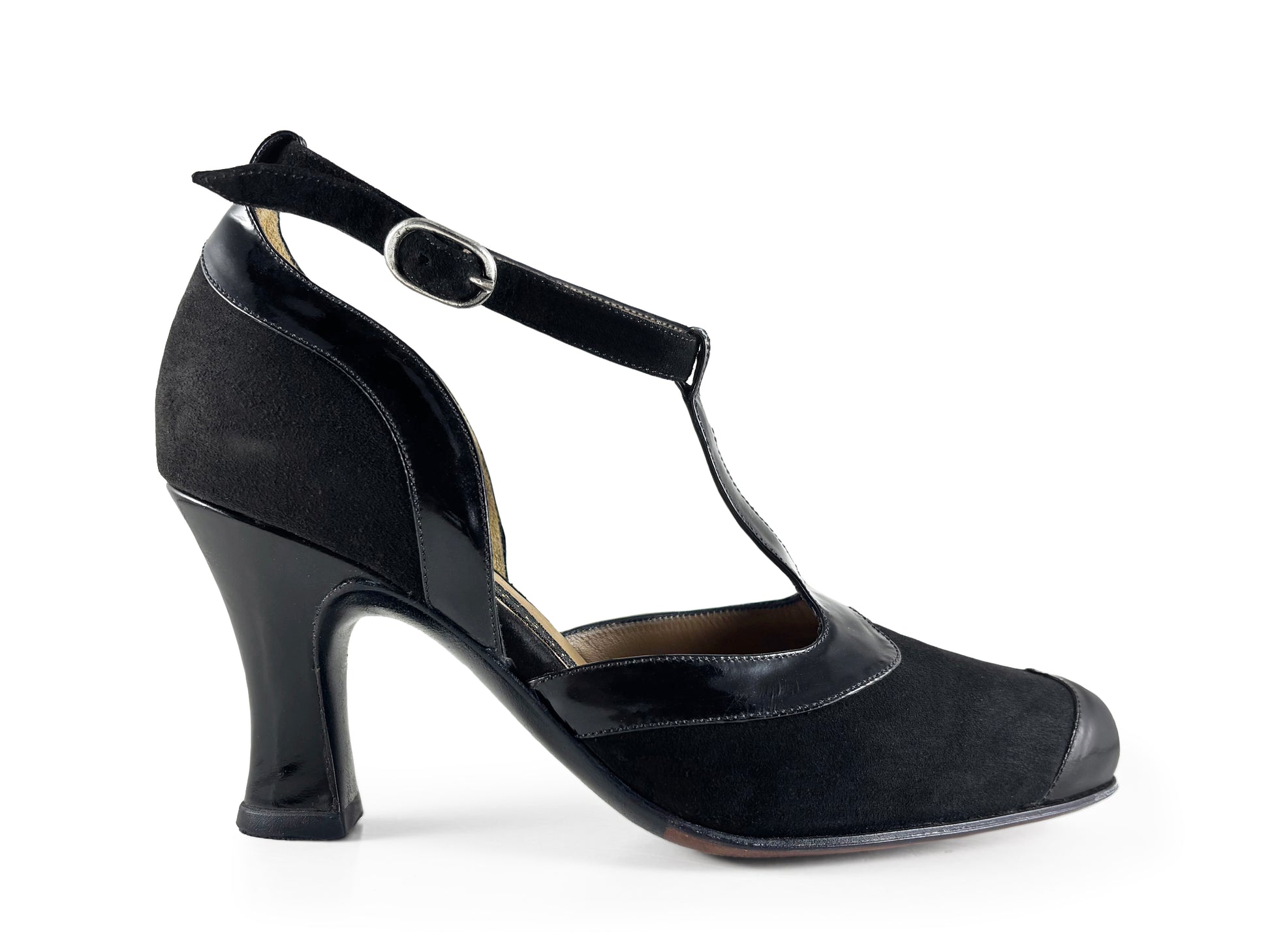 Shown in Black Suede with Black Patent trim.
