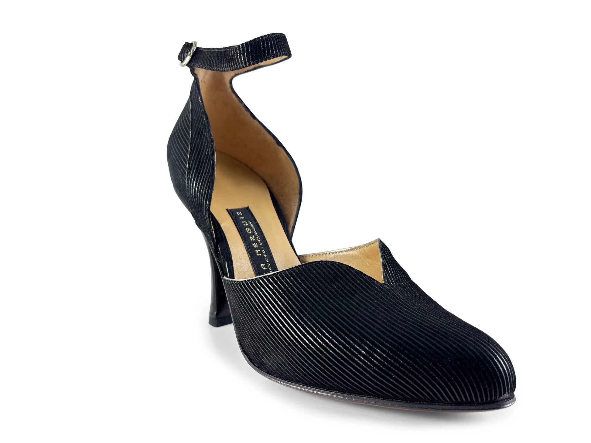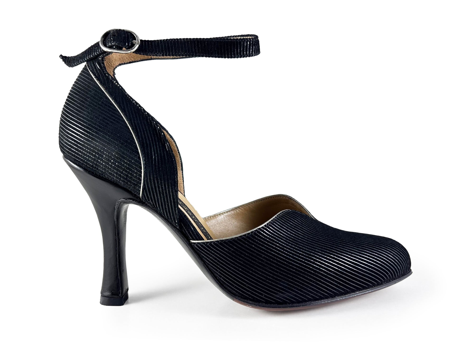 Shown in striped Black Laminated Suede with Pewter Leather trim and heel in exquisite Black Patent.