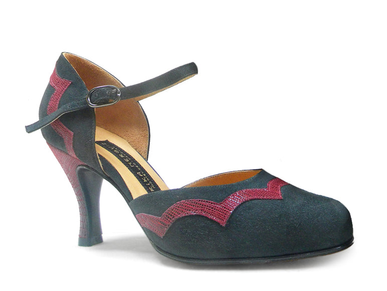Shown in Blue Suede with delicate trim in Red Laminated.
